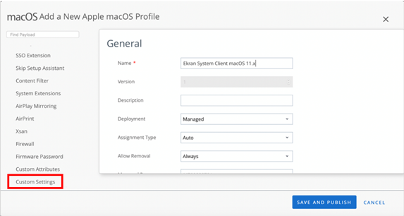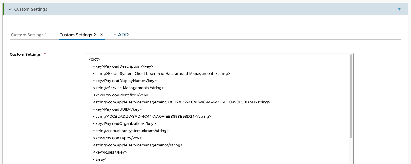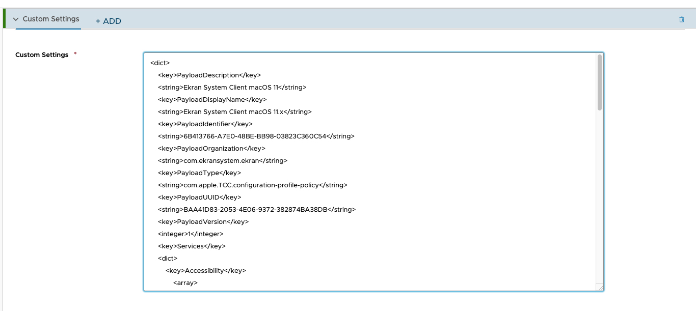 7. Copy the contents of the Ekran System Client macOS 11.x.xml file into the empty Custom Settings field.
