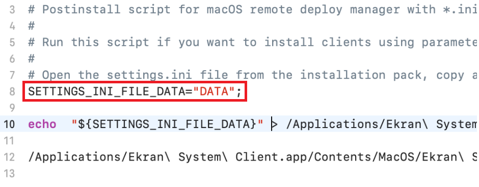 Instead, if the EkranClient folder in the macOS installation package contains a settings.ini file, copy the contents of the EkranClient/remote deploy/postinstall_ini_file_support.sh script file into the Post Install Script field, and then copy the contents of the settings.ini file into the SETTINGS_INI_FILE_DATA variable to replace the DATA value in the Post Install Script field, and Steps 8 and 9 (below) should then be ignored.