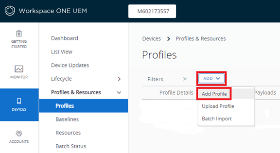 1. In the navigation panes (on the left), select Devices > Profiles & Resources > Profiles, and on the Profiles page, click the Add button, and then select Add Profile in the drop-down list.