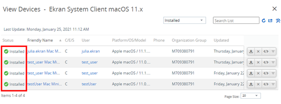 11. To see more details, in the pop-up window, click on the links showing the statuses. For example, if you click on Installed, you will see the list of devices which the Clients have been installed on.