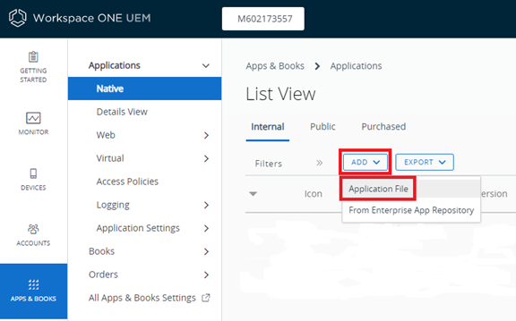 1. In the navigation panes on the left, select Apps & Books > Applications > Native, and then click the Add button on the List View page, and select Application File in the drop-down list.