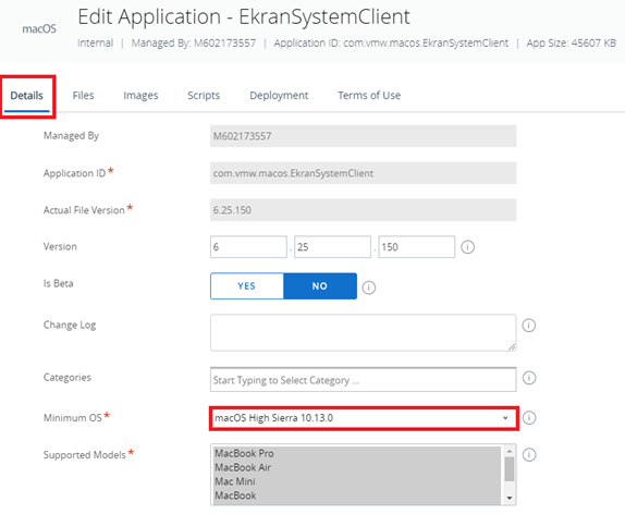5. On the Details tab, select the oldest-supported version of macOS in the Minimum OS field.
