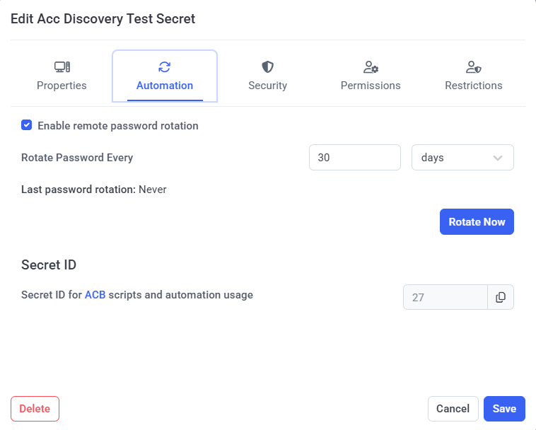 4. On the Automation tab, select the Enable remote password rotation checkbox, and specify how frequently the account's password will be rotated automatically (in the Rotate Password Every fields), or click the Rotate Now button to rotate the password immediately.