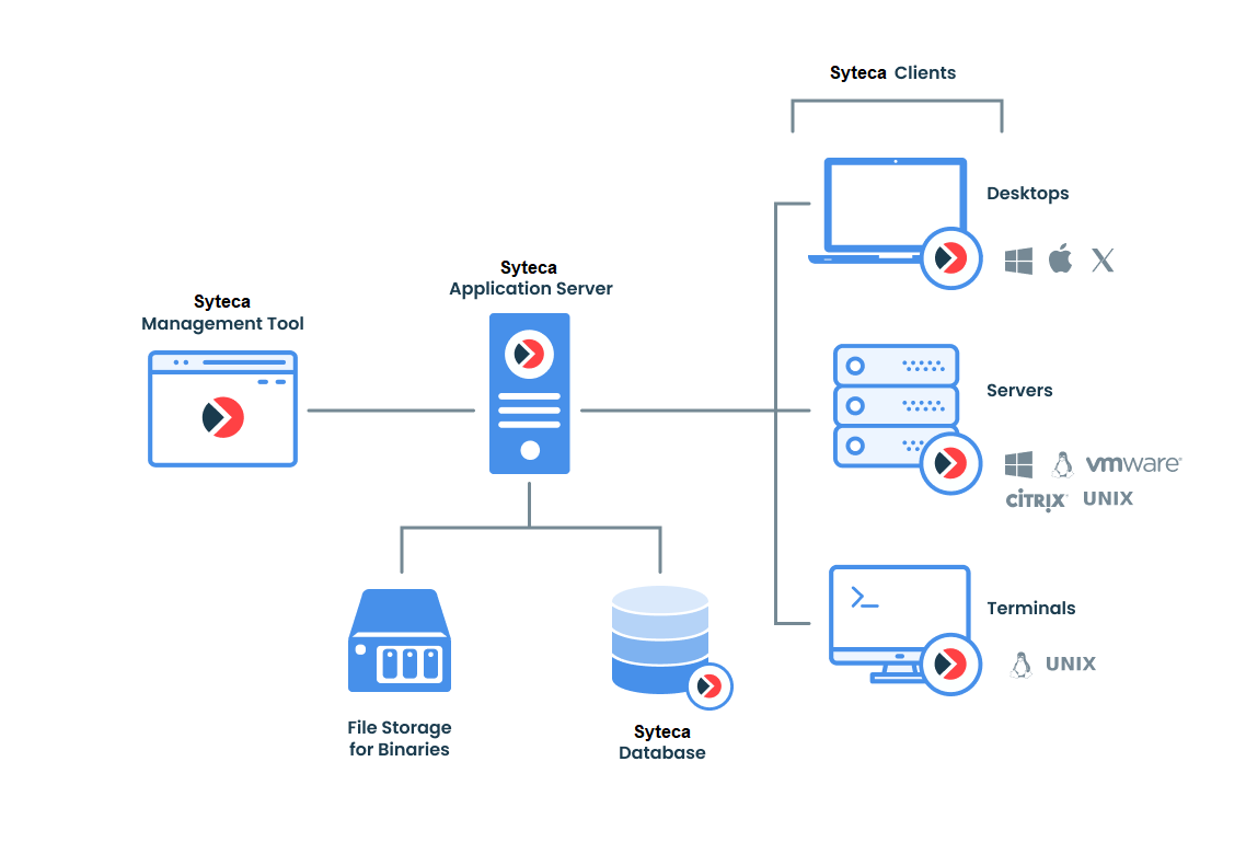 - Syteca Linux/Unix Clients (further referred to as Linux Clients): Hosted on remote computers, Linux Clients record screen captures and terminal input/output data (including commands executed), and send this interactive data to the Application Server.