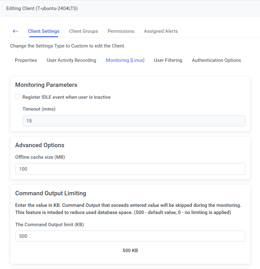 NOTE: After updating the system to Syteca version 7.0.50 (in which this parameter was implemented) or later, for Clients installed previously, the Command Output limit is set to the default value (of 500 KB).