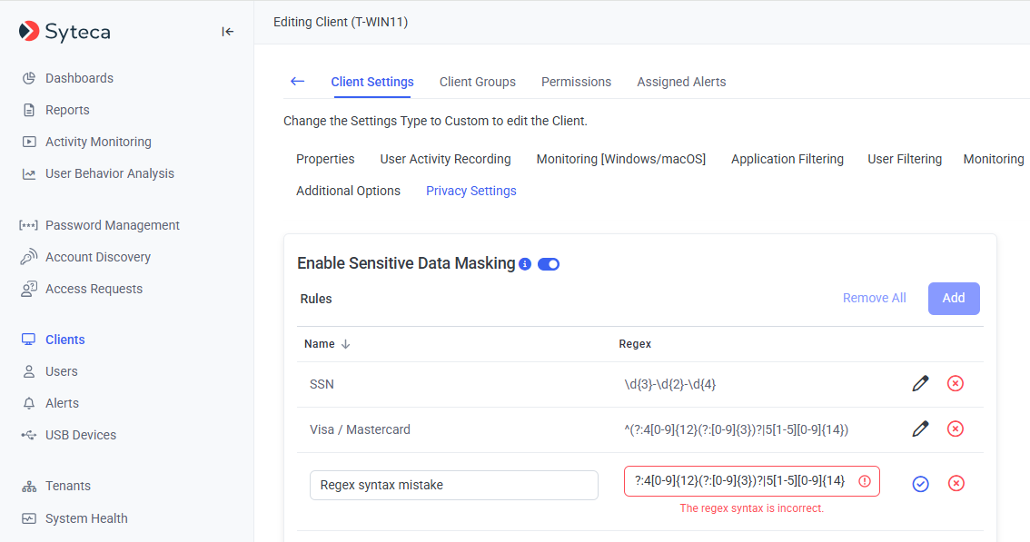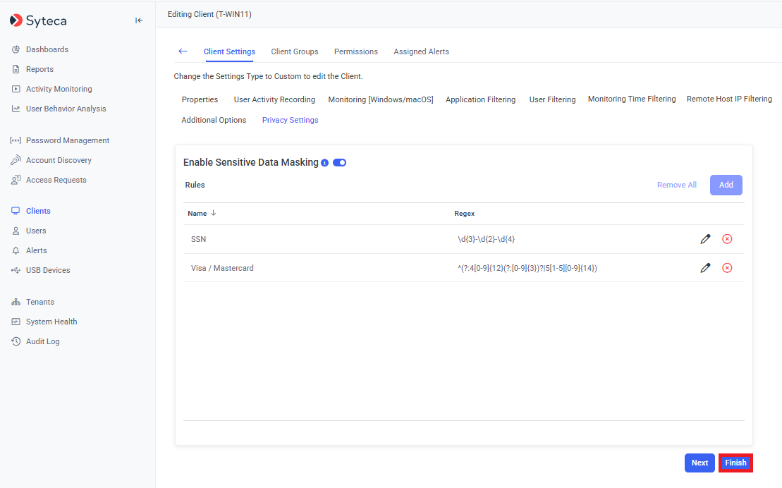 To configure the Sensitive Data Masking feature for a Windows Client (or all the Windows Clients in a Client group), do the following: