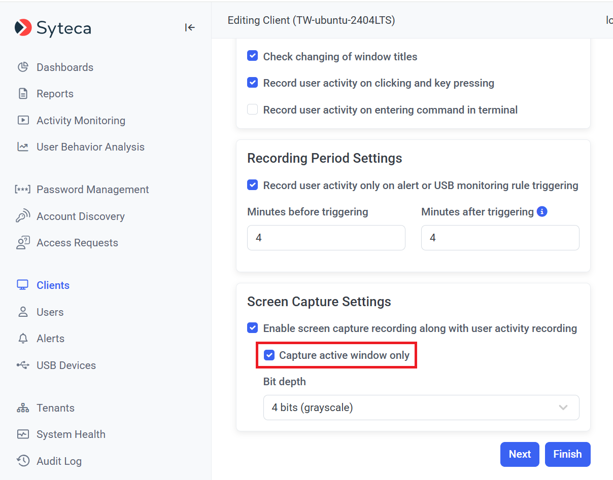 4. On the User Activity Recording tab, in the Screen Capture Settings section, select the Capture active Window only checkbox.