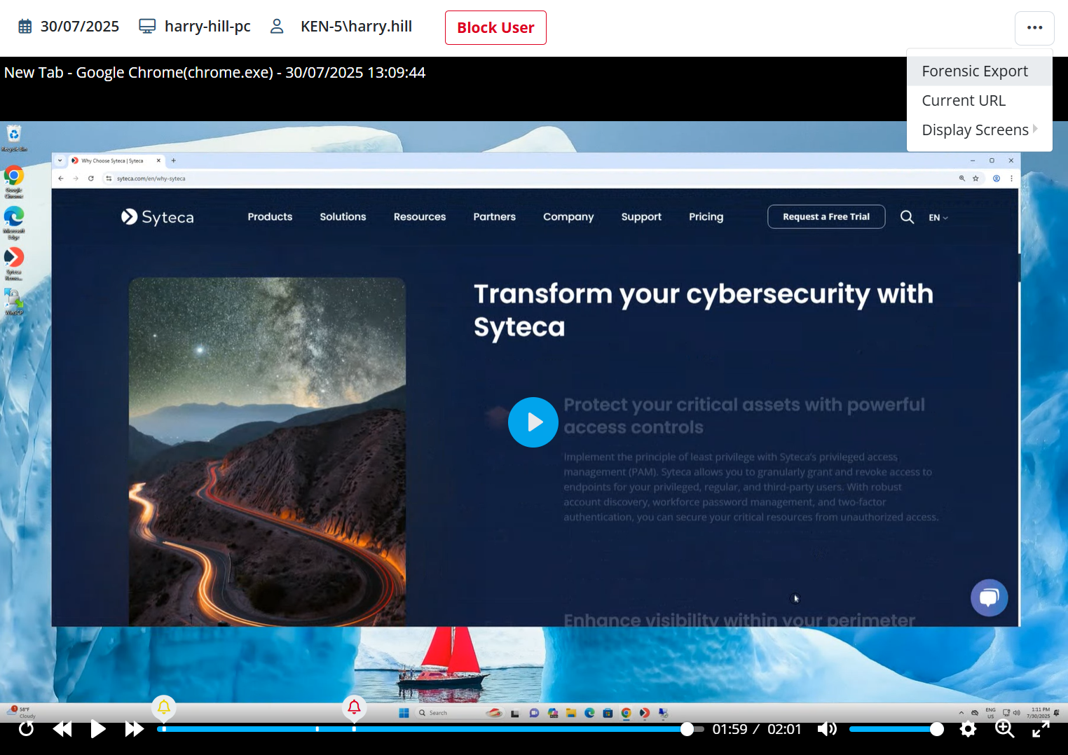 Any of these screen captures / video frames or graphical representations can be viewed individually by clicking on the required activity record in the Metadata grid (which is on the right of the Session Player), or all of the monitored data together can be viewed by playing the session.