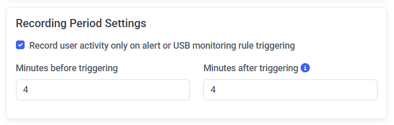 - Record user activity only on alert or USB monitoring rule triggering: If this checkbox is selected, user activity will only be recorded when alerts rules are triggered, with how long before and after each alert event will be recorded specified as follows: