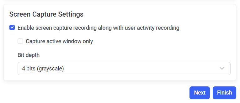 - NOT AVAILABLE IN SAAS Bit depth: By default, screen captures are recorded in grayscale with 4-bit color depth. This is the optimal value, to ensure reasonable resolution of the screen captures, while not increasing the amount of data stored too much. Alternatively, a color depth of 8 bits or 24 bits can be selected.