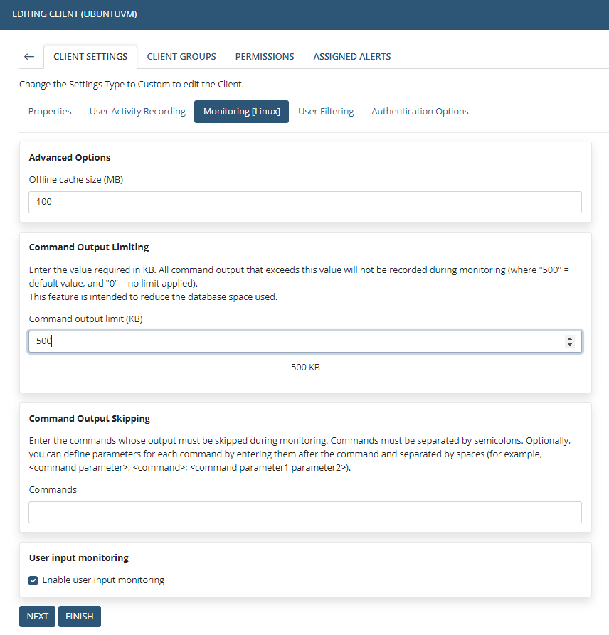 3. In the Management Tool (while editing a Client / Client Group), on the Monitoring [Linux] tab, in the User input monitoring section (at the bottom of the page), select the Enable user input monitoring checkbox.