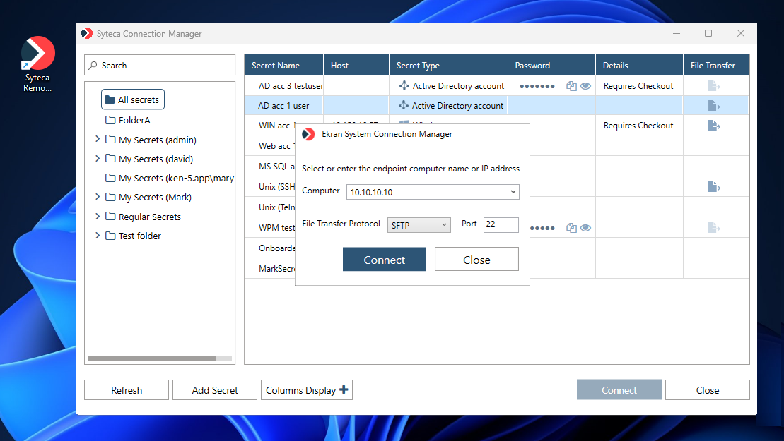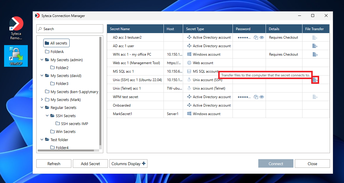 When the File Transfer feature is configured for a secret, and the permissions are enabled for a user of a secret, the user is able to transfer files to/from the remote computer by way of this secret in the WCP application, instead of directly connecting to the remote computer (by clicking the Connect button) in Syteca Connection Manager.