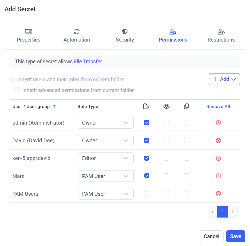 NOTE: Alternatively, the users / user groups who will be able to use the secret, along with their permissions, can be inherited from the parent folder if configured appropriately in this folder (except from the "All secrets" folder) by selecting the "Inherit users and their roles from current folder" checkbox (to inherit the users / user groups along with their Role Type permissions from the current folder) and the "Inherit advanced permissions from current folder" checkbox (to inherit the "File Transfer" advanced permissions for the users / user groups from the current folder).