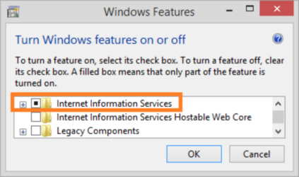 3. The Windows Features window that opens, in the Features tree-view, select the Internet Information Services checkbox, and then click OK.