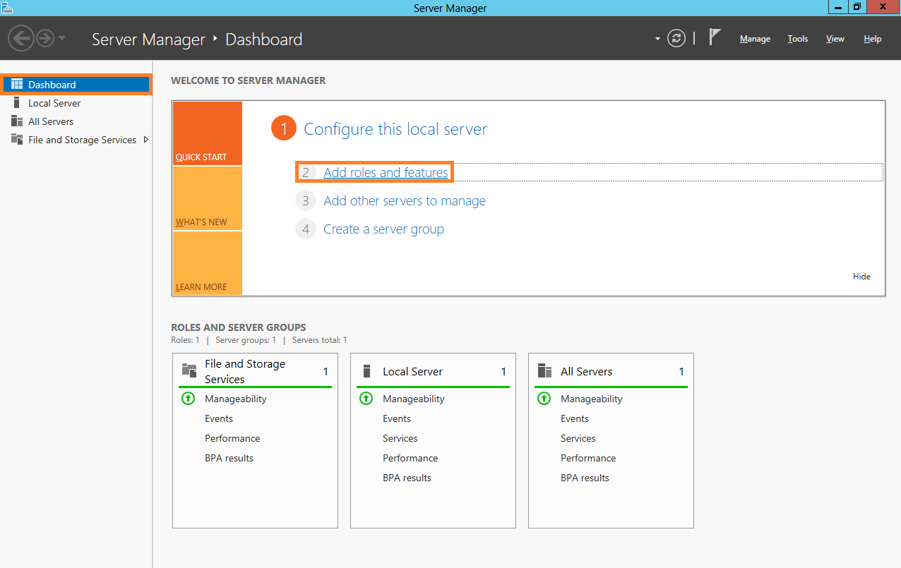 2. In the Navigation pane, select Dashboard, and then click Manage > Add roles and features.