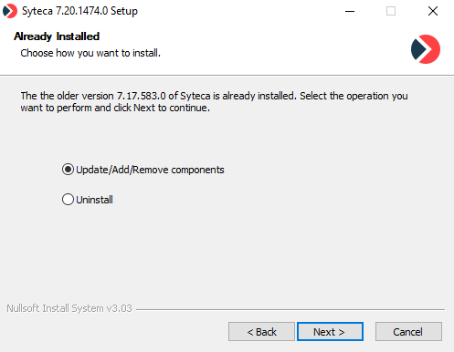 4. On the Already Installed page, select Update/Add/Remove components, and then click Next.