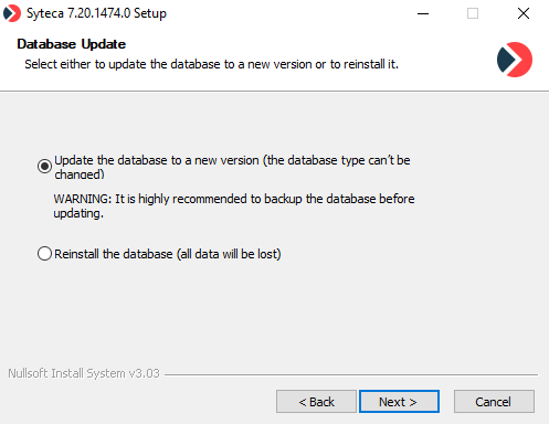 Updating Syteca Application Server is performed by using a newer version of the Syteca Application Server installation file. During the update process, you can select either to update the existing database to a newer version or to simply reinstall it.