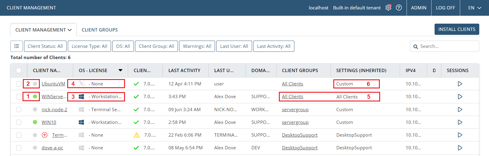 NOTE: In the screenshot above, two Clients are shown (where: 1 = Client is online; 2 = Client is offline; 3 = Client has the appropriate license, 4 = Client does not have a license; 5 = Client inherits its settings; 6 = Client uses its own settings).
