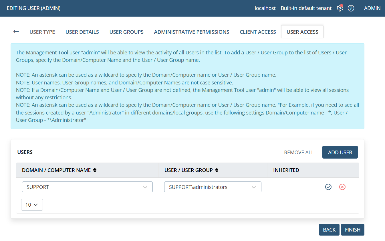 NOTE: In the screenshot above, the "admin" user being edited has permission to view the sessions of endpoint users who are in the "SUPPORT\administrators" AD group only, which means that the "admin" user will not be able to view the sessions of any other users. If the table in the grid is empty, the "admin" user will be able to view the sessions of all endpoint users (i.e. without any restrictions).