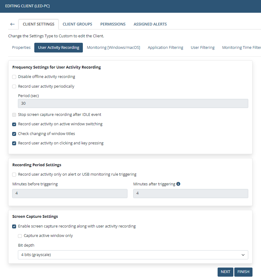• User Activity Recording: The appropriate checkboxes are selected (e.g. the checkboxes selected in the default Client configuration can be used, as shown in the screenshot below).